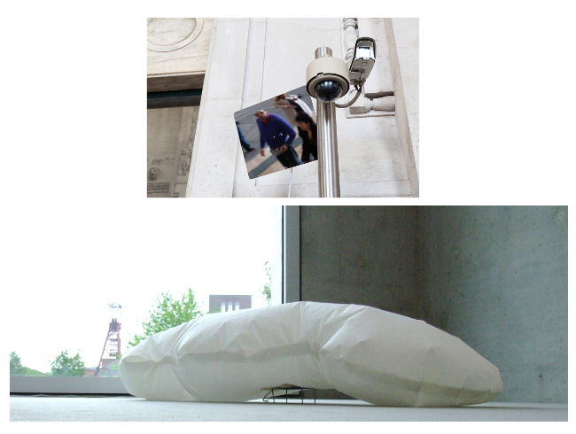 Bei den eigens für die Ausstellung entwickelten pneumatischen Plastiken von Claudia Schmitz dürfen die Galeriebesucher auch mal selbst Hand und Fuß anlegen. Sie sind angehalten, die Objekte zum Leben zu erwecken, sie zu gebrauchen und somit ihre Form zu entfalten. Per Fußpumpe lässt sie die BesucherInnen eine Barriere aus Fallschirmseide errichten, die den Raum in zwei Hälften teilt - um schließlich wieder in sich zusammen-zu-sinken.